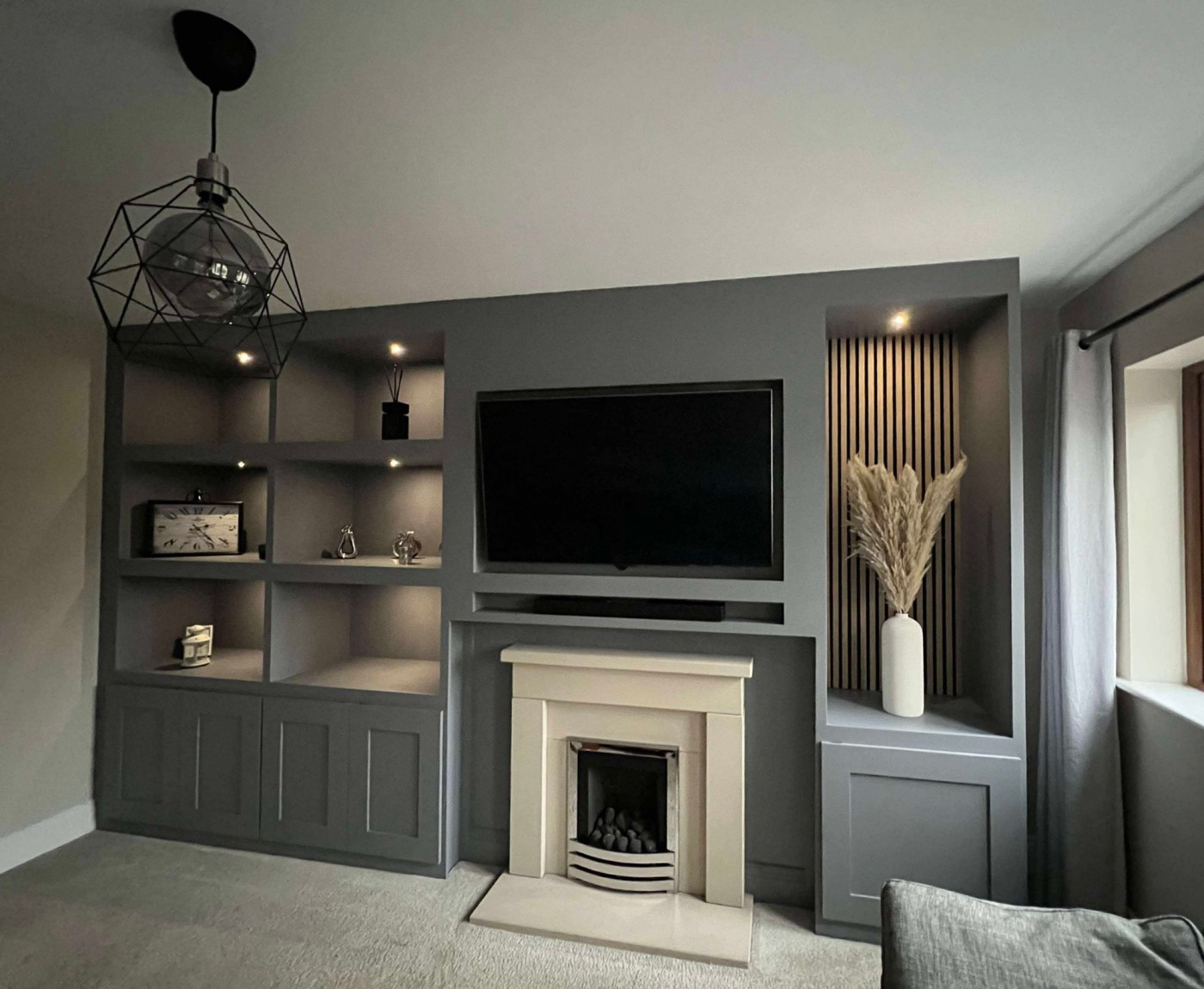 The customer wanted the full wall of their front room working on. This wall has it all – inset TV, large shelving, storage cupboards below, and even a small amount of panelling to finish it off – all surrounding the bright white fire place.