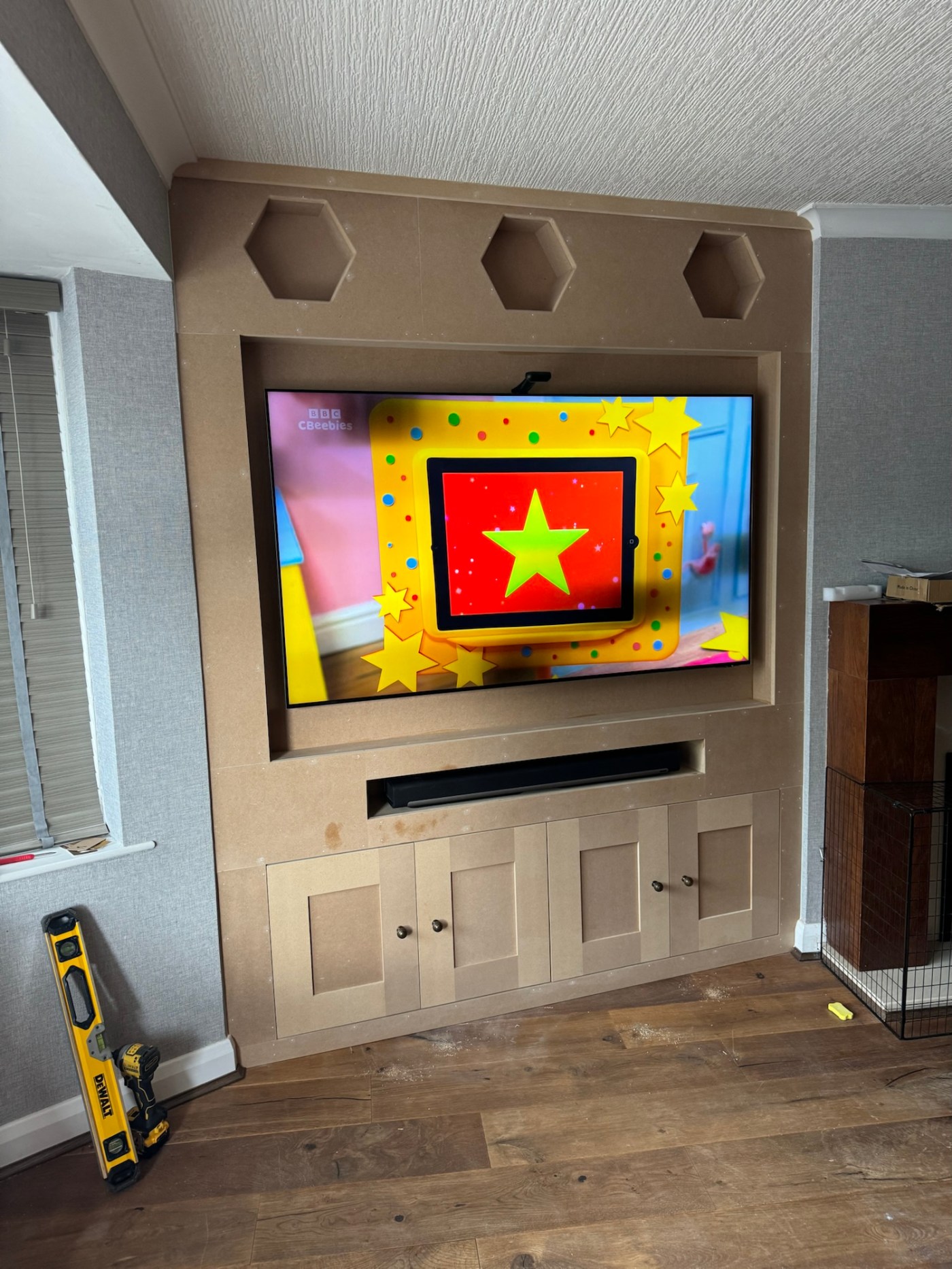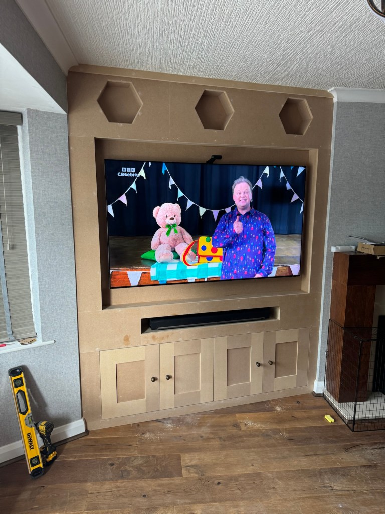Hexagonal shelves (or ‘honeycomb’ shelves) finish this media wall off nicely – it also included space for the customer’s sound bar.