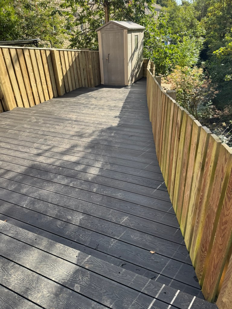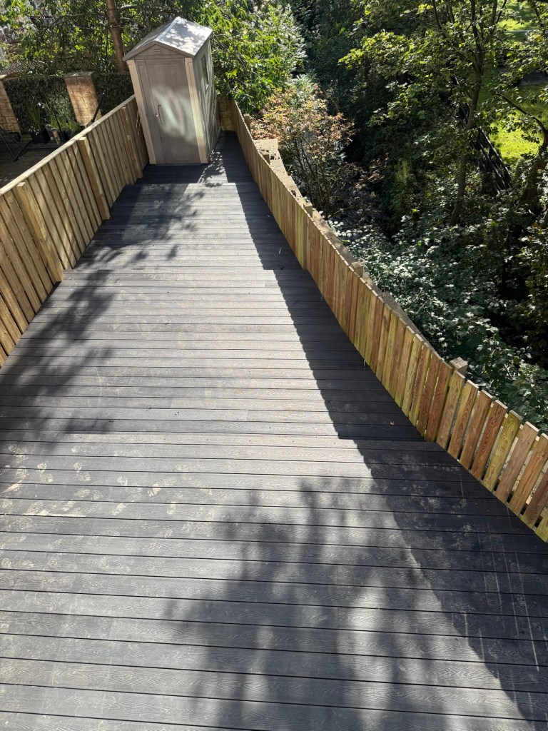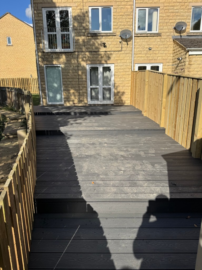 This job includes perimeter fencing and composite decking of a large, sloped back garden – small steps in the decking make this one multi-tiered, and makes us of even the small space space at the back where the garden comes to a head.