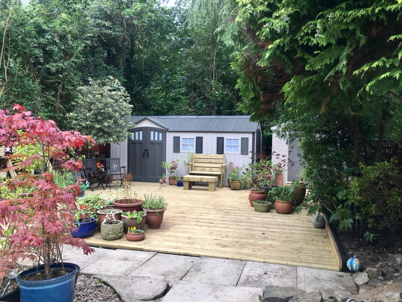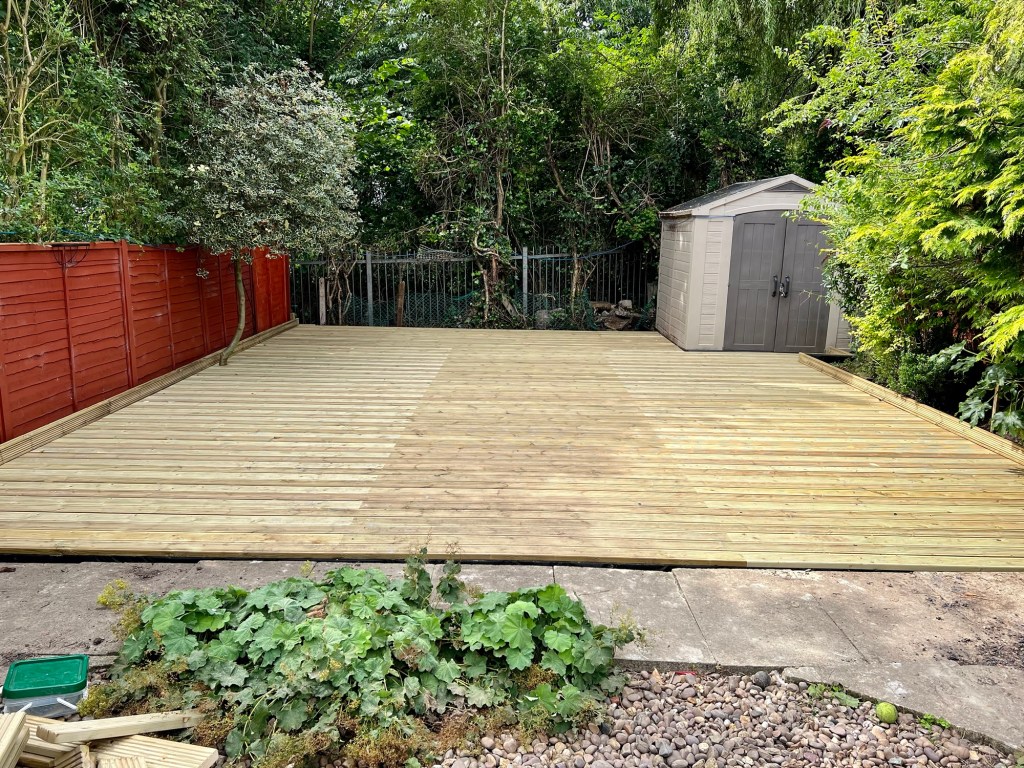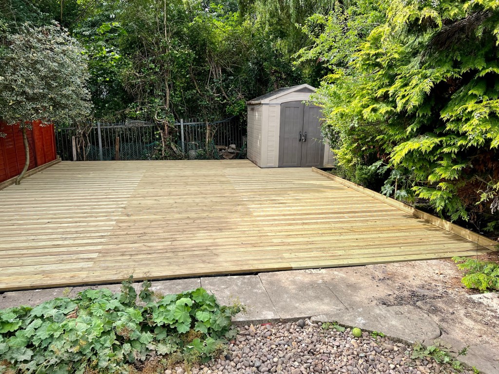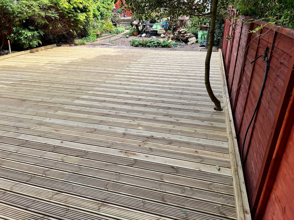 Sometimes simple just works! This customer wanted a large, flat, decked area for existing sheds that they could decorate as they like. The only caveat is that they wanted to keep the existing tree (seen on the left in the first picture) – no problem! Andy was able to construct the decking around the tree, leaving a small, almost hidden hole for the tree to continue to grow.