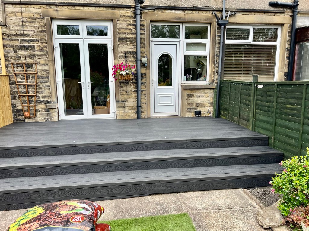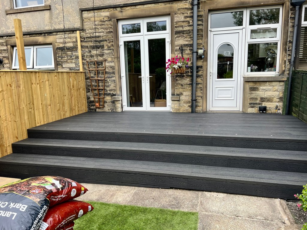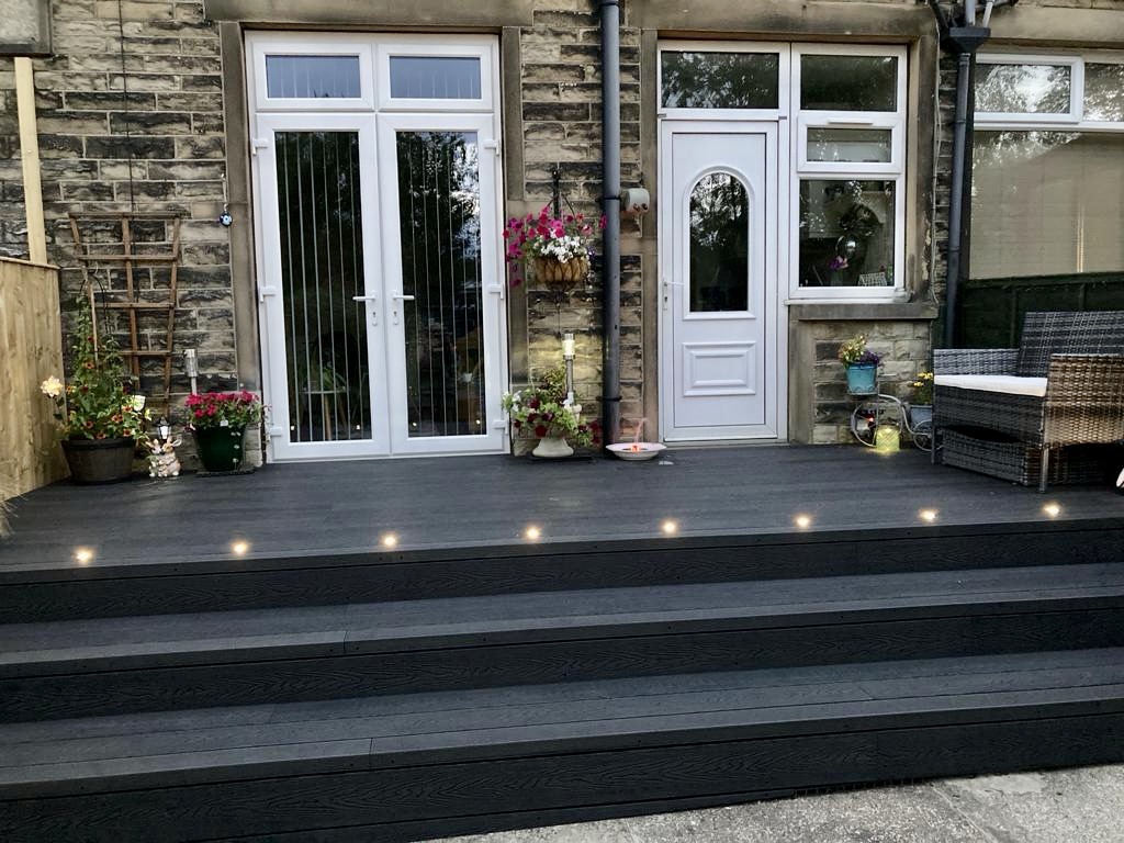 This composite decking has spotlights embedded in the top tier, as well as short stairs leading to the rest of the garden.