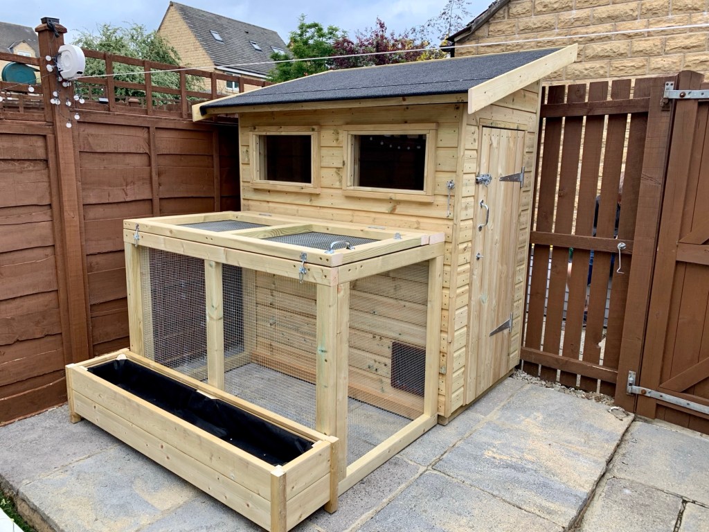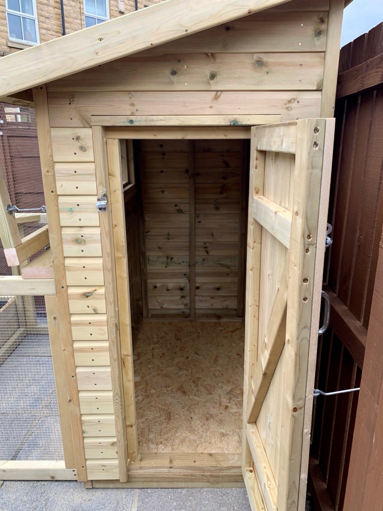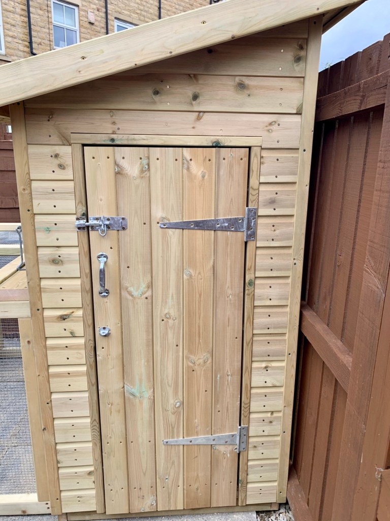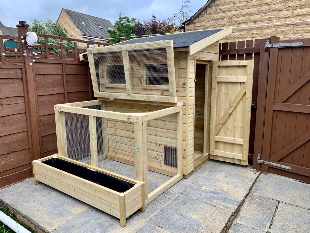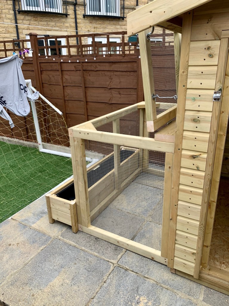 The customer needed an outdoor space that was safe for their long-eared buddies to play in! This custom-built rabbit hutch has an area for them to enjoy the fresh air and grass, as well as a sheltered indoor area to keep them dry and toasty when the weather fails. It also doubles as a storage shed for the food and bedding!
