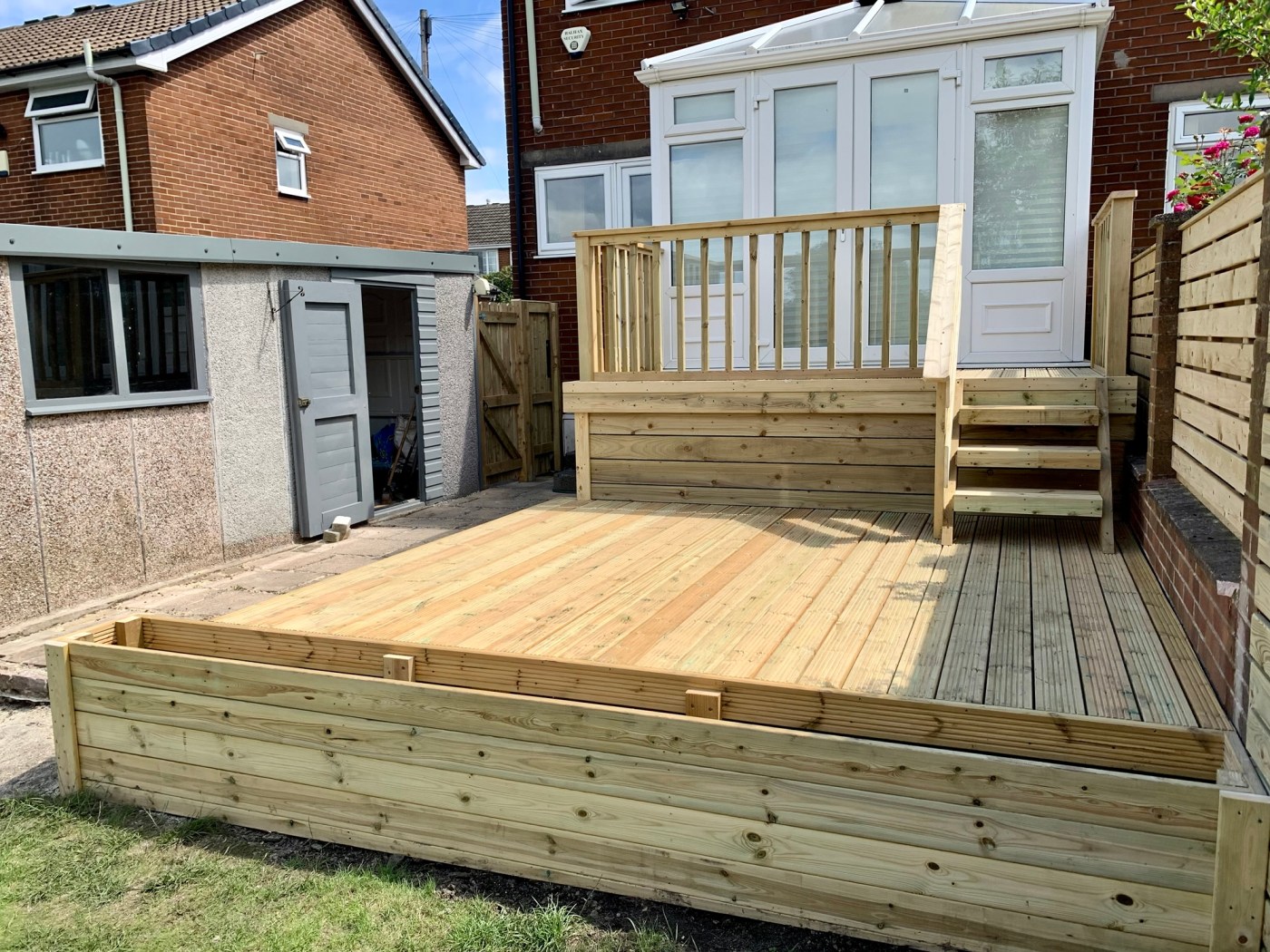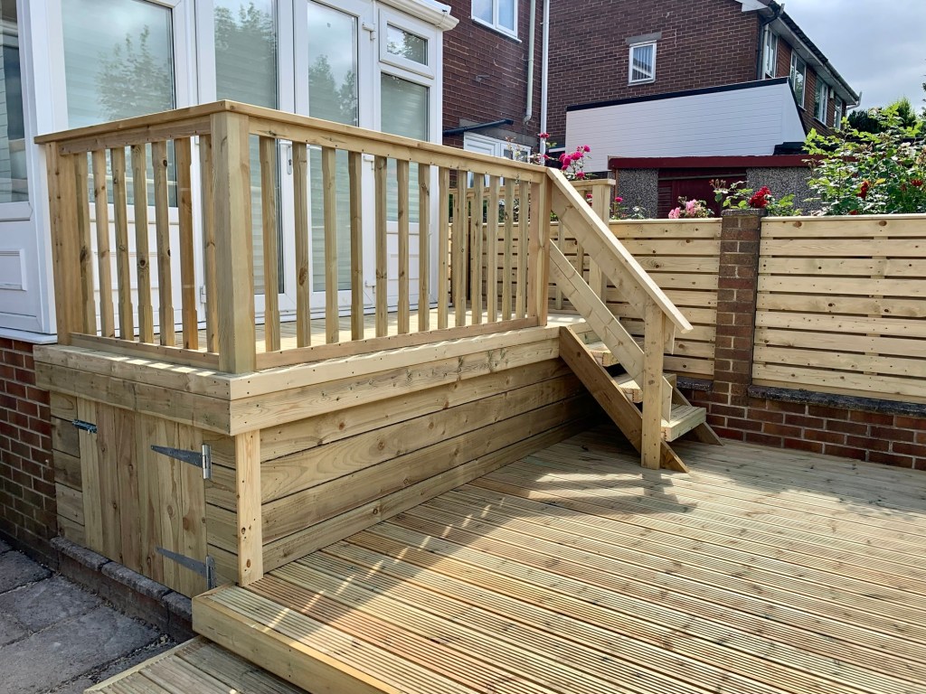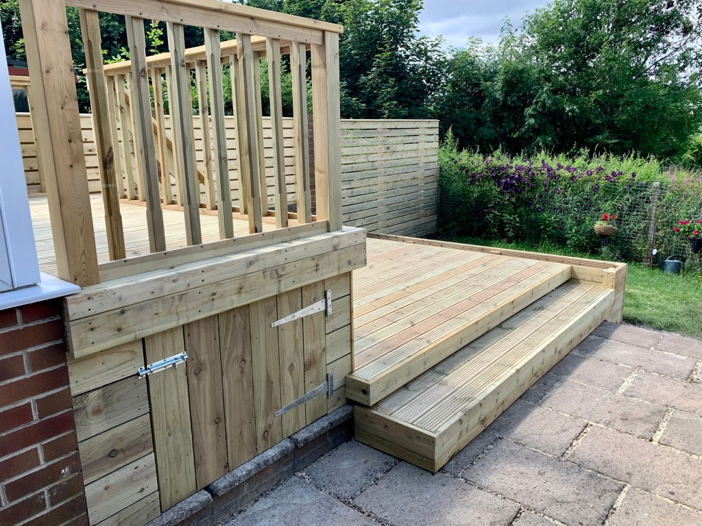 This job was retrofitted to include access to the customer’s existing conservatory, and includes planters connected to the main garden area, as well as a storage area beneath the highest tier – making use of what would’ve been wasted space!