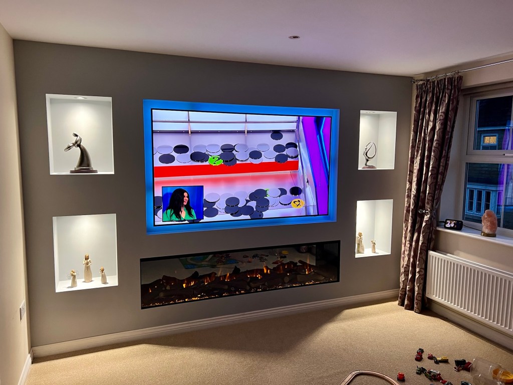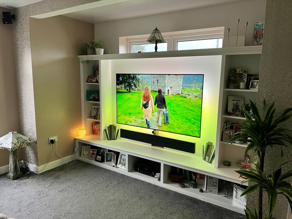 Back-lit TV? Ample shelving and cupboards? Hidden pesky wires? Floating soundbar? Say no more. Just needs paint.