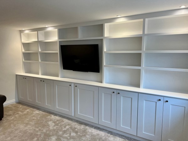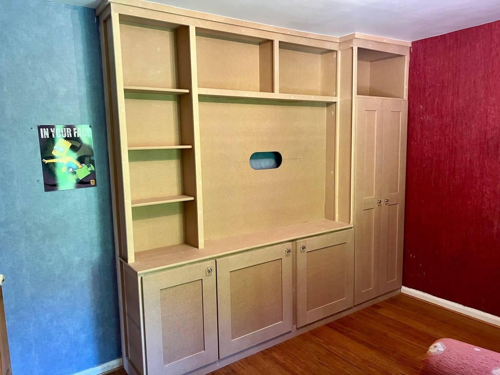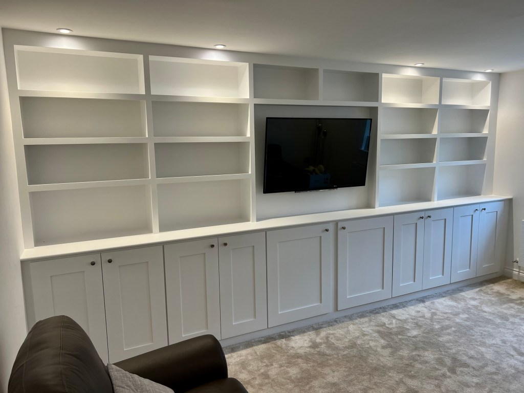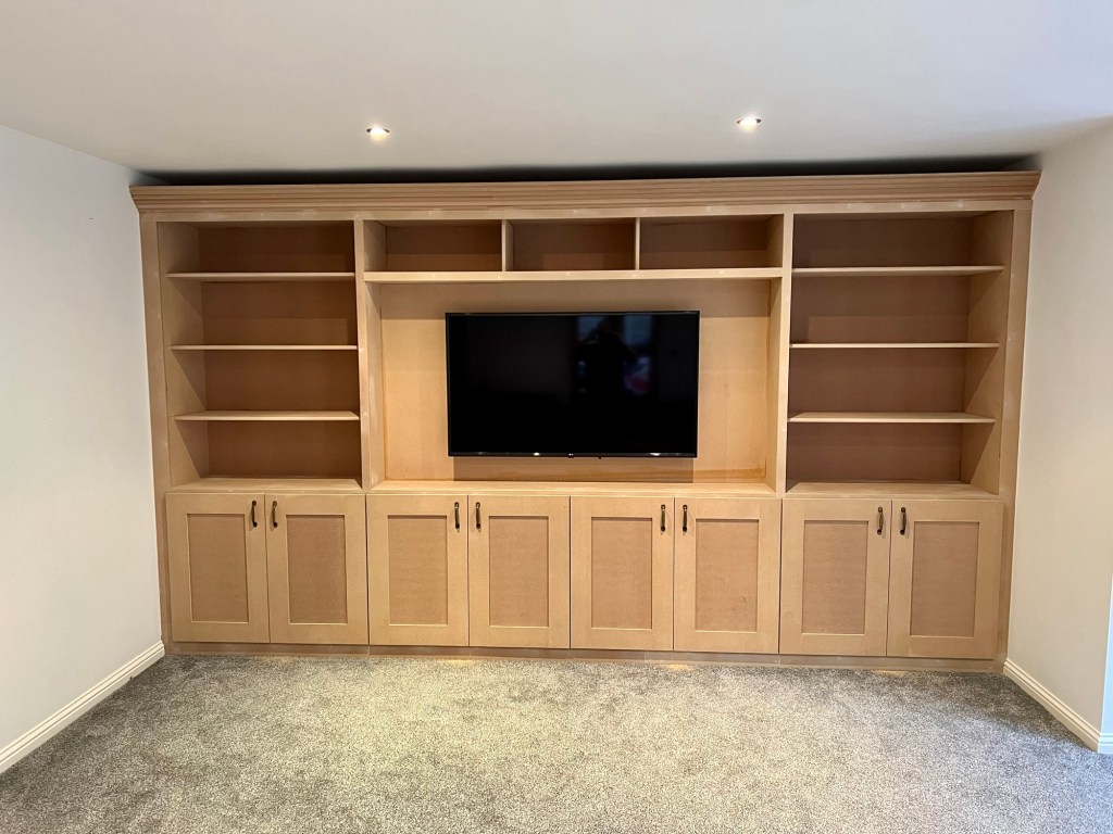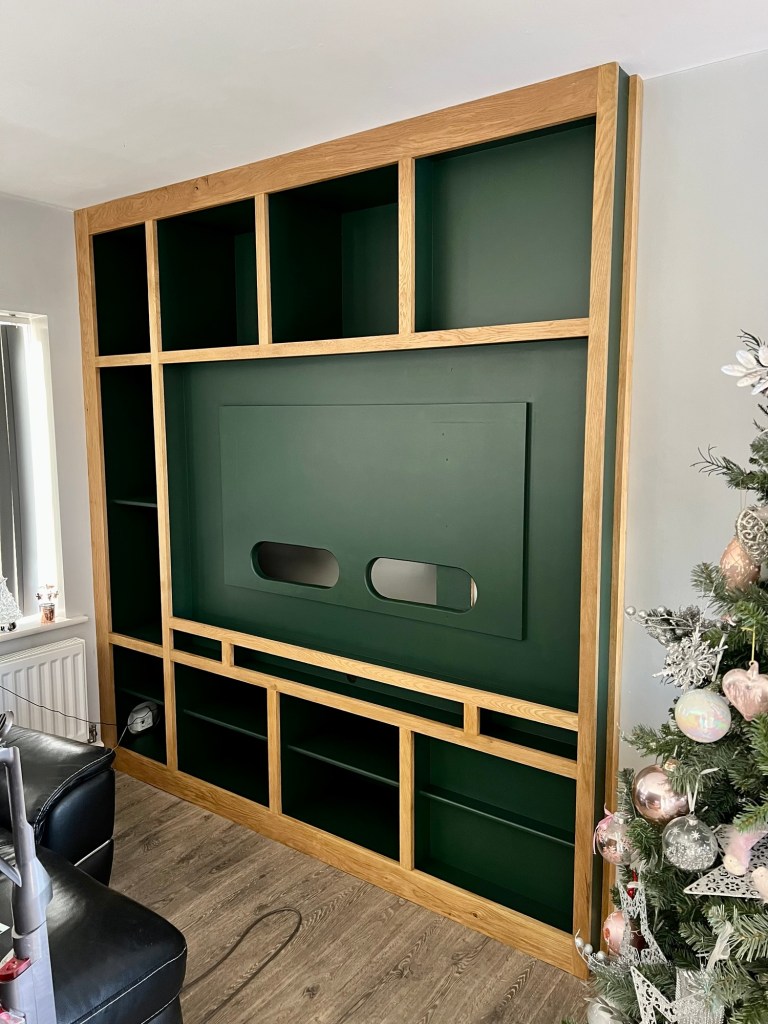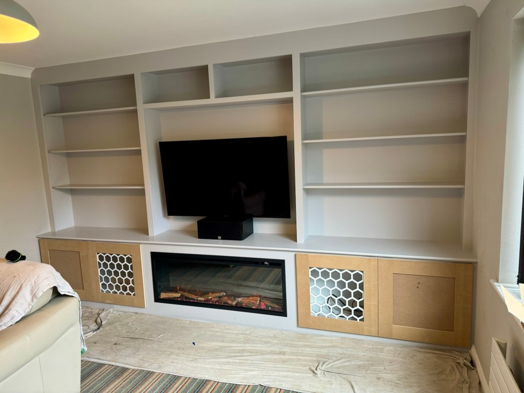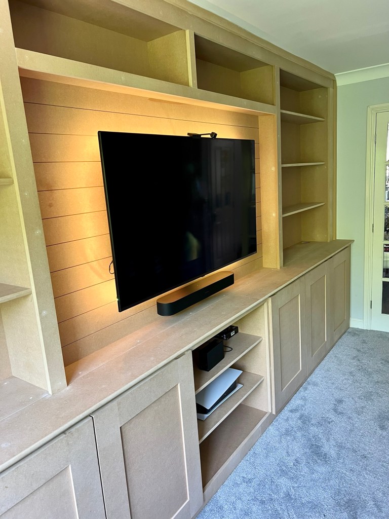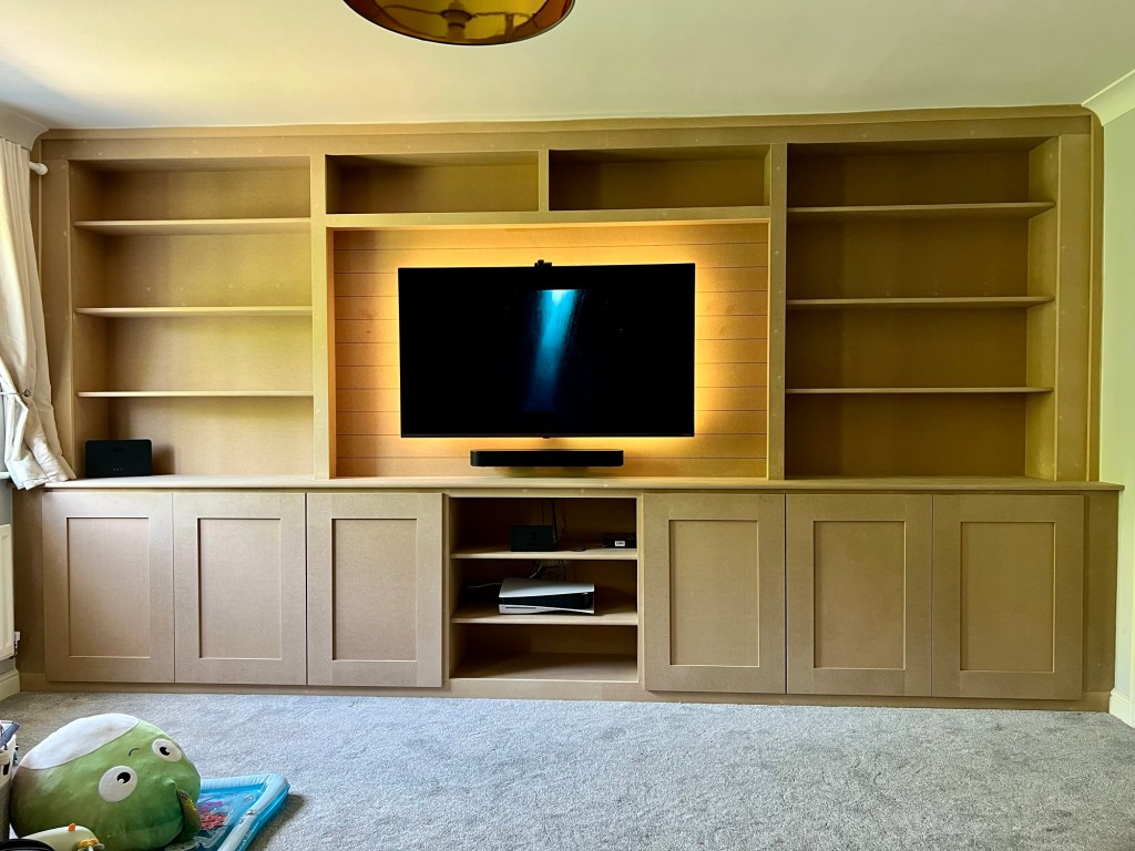 A rarer picture of the in-between stage – the construction of the media wall has been completed, and is eagerly awaiting the customer’s choice of paint. A large cupboard on the left is perfect storage space for whatever you want close to hand – consoles, boardgames, blankets, everything to make your living room a cosy, comfortable entertainment space.