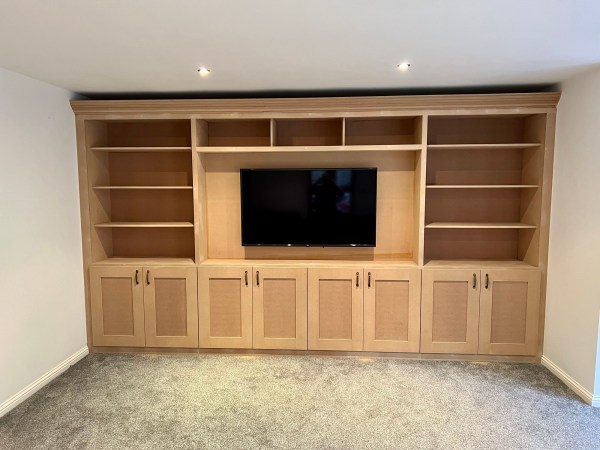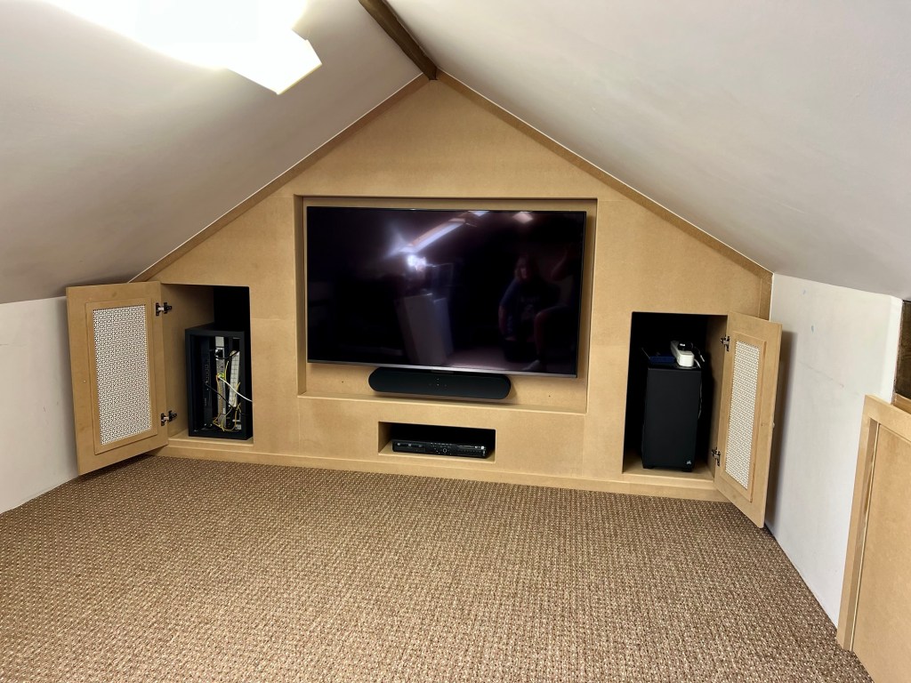 This media wall was built in a dormer to fit the apex of the roof! Making the most out of a little space, it also includes two cupboards to hide wires and speakers.