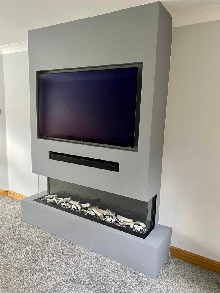 Finished in a cosy grey, this one features peek-a-boo cupboard doors with honeycomb lattice, and plenty of surrounding shelves, finished nicely with an electric fire below the centrepiece – the telly!