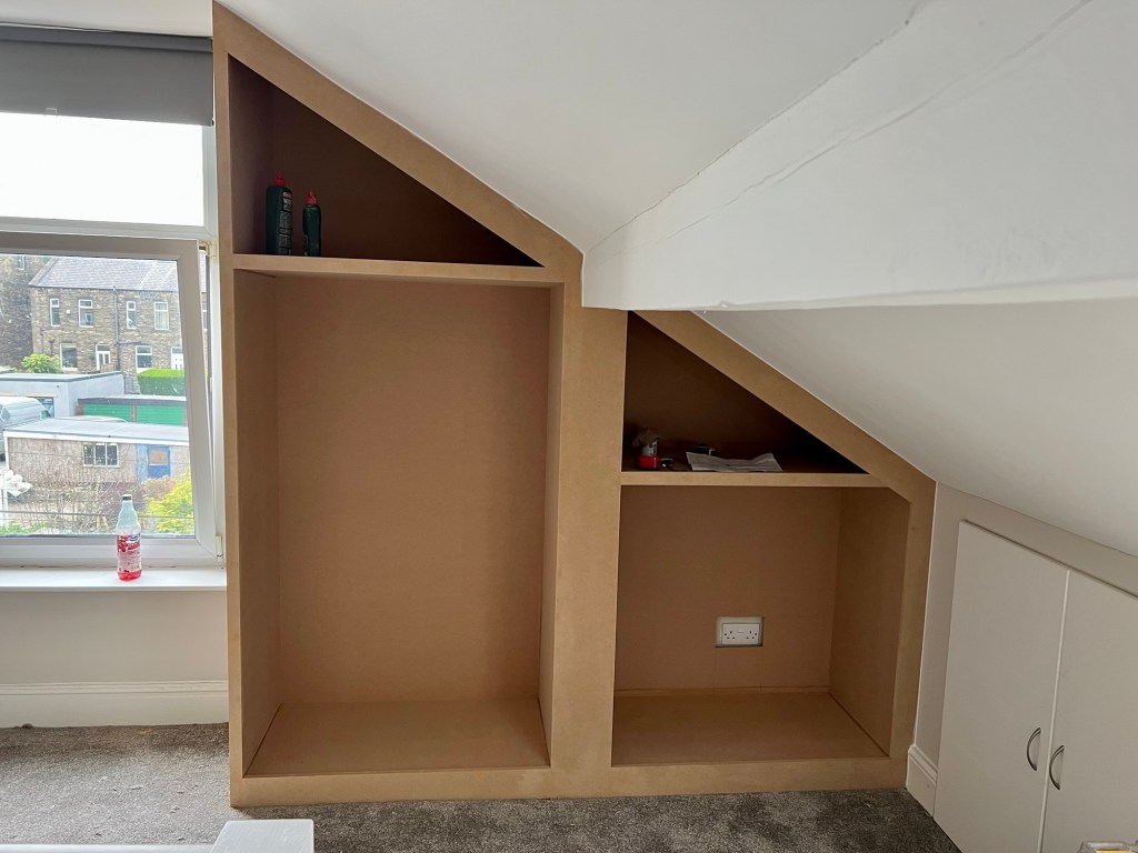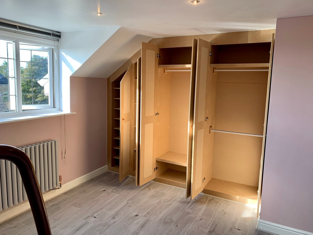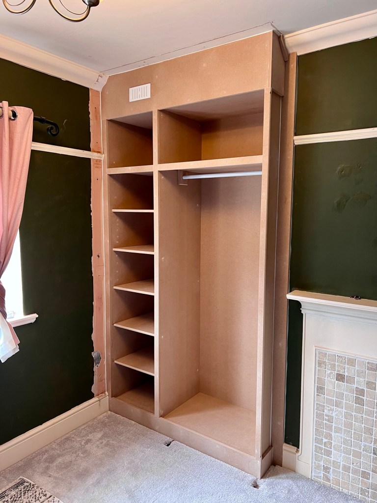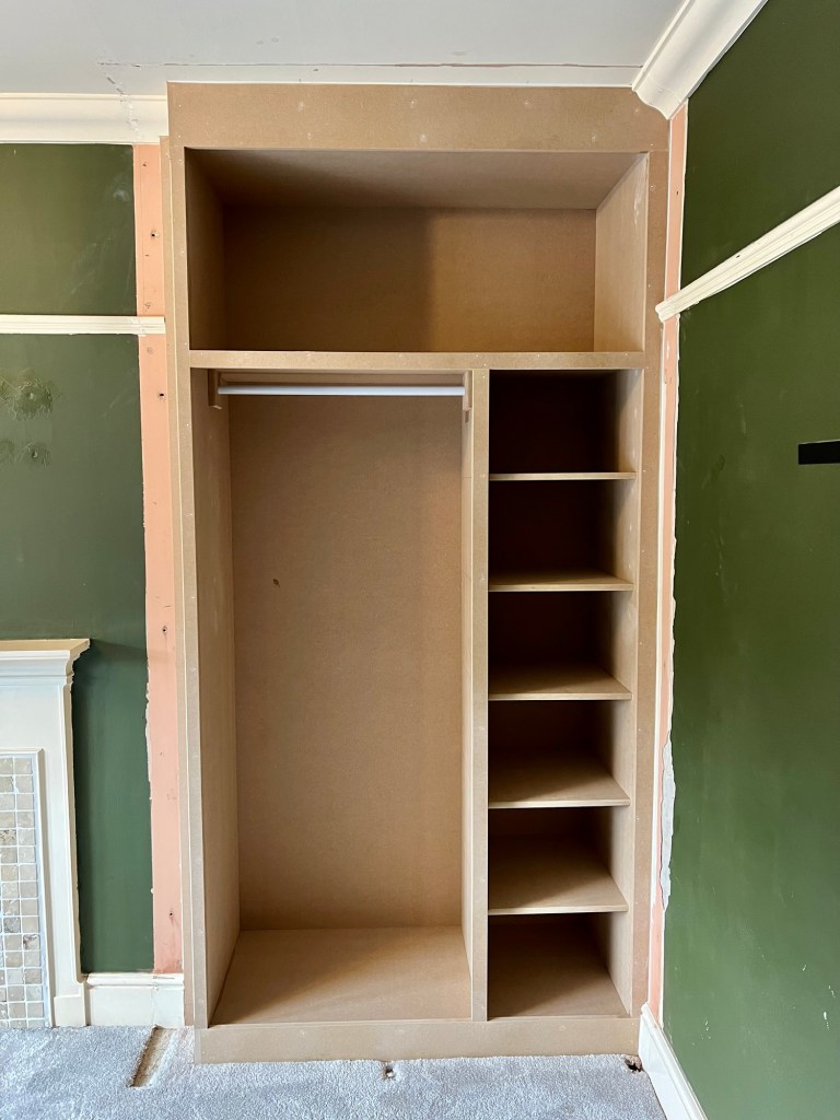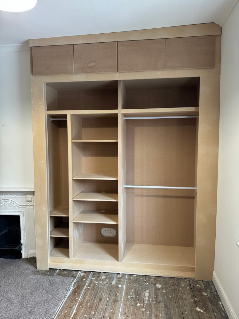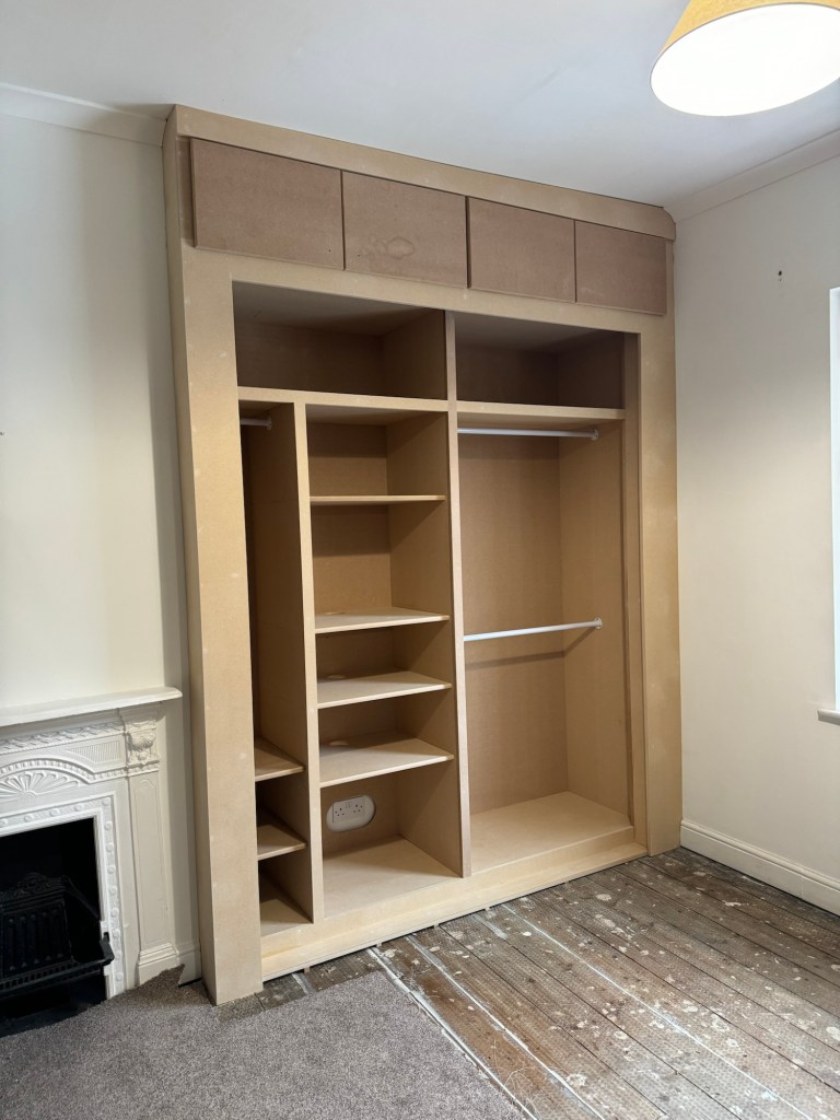 This built-in wardrobe fills the alcove next to the chimney breast nicely, includes over-head storage cupboards for the things you don’t always need handy, and keeps the existing plug socket accessible. Finished nicely with two sliding mirror doors.