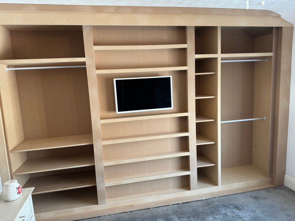 This built-in wardrobe includes its own MINI MEDIA WALL, a perfect space for a little telly and some shelving for your smaller toiletries!