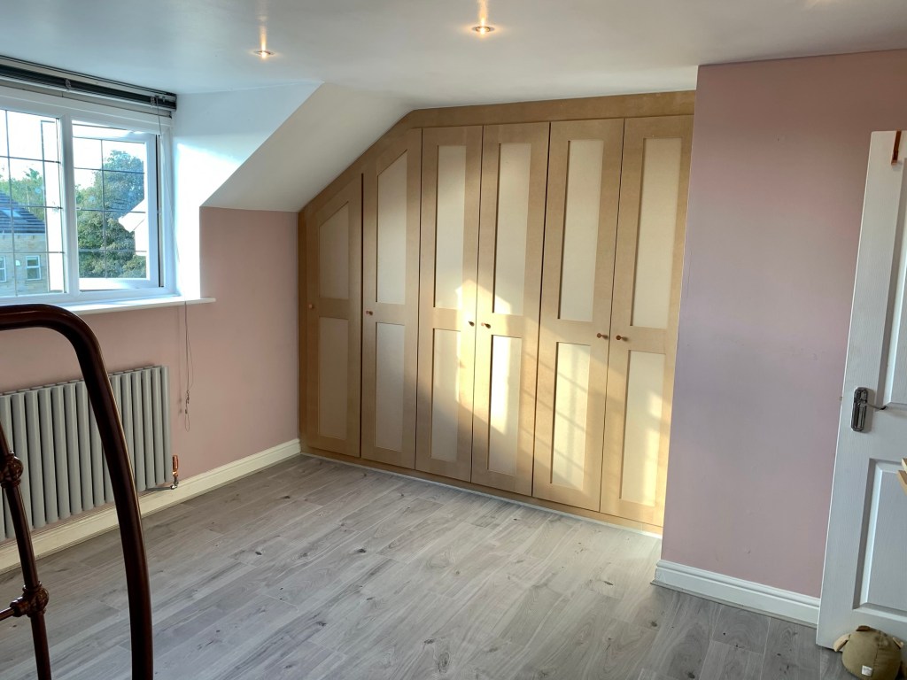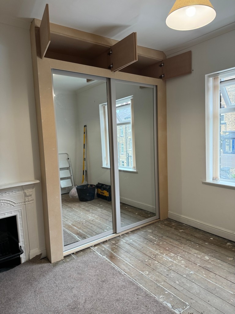 Another set of built-in wardrobes flanking either side of the customer’s chimney breast! Whilst the insides of the wardrobes are mirrored, the customer opted for asymmetrical doors.