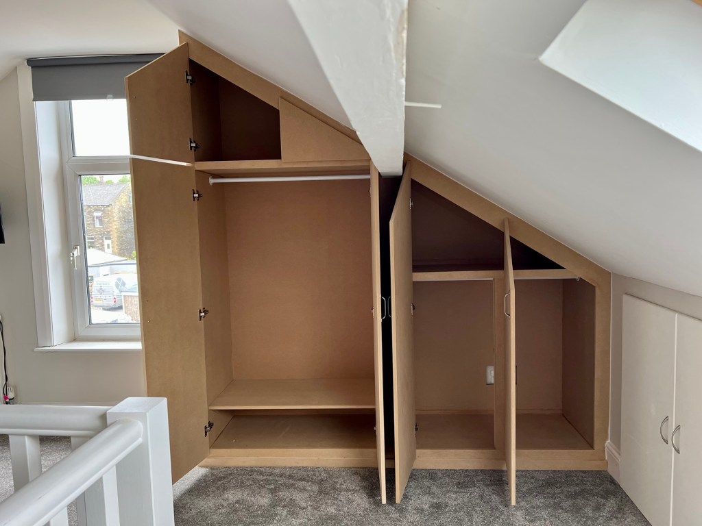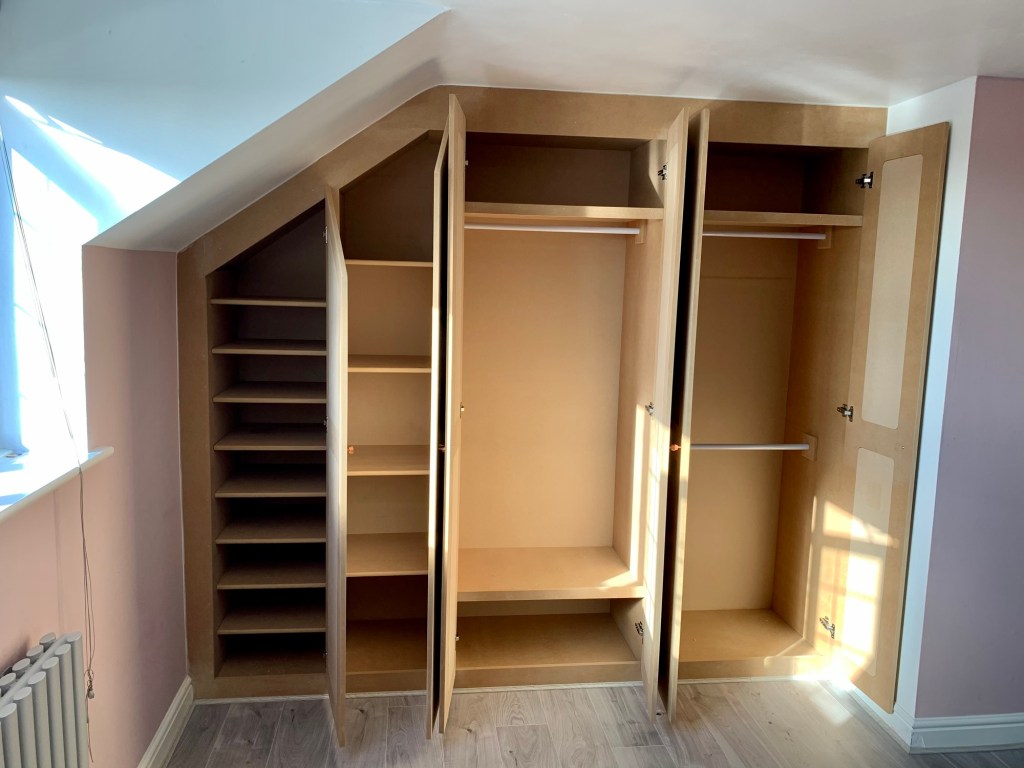 This project was built to fit the sloping roof of the attic, and makes use of the space with lots of shelves for shoes, handbags, etc.