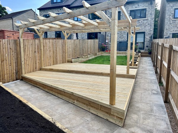 The whole shebang – decking, fencing, glass balustrades, steps to access the rest of the garden, and even a log store.