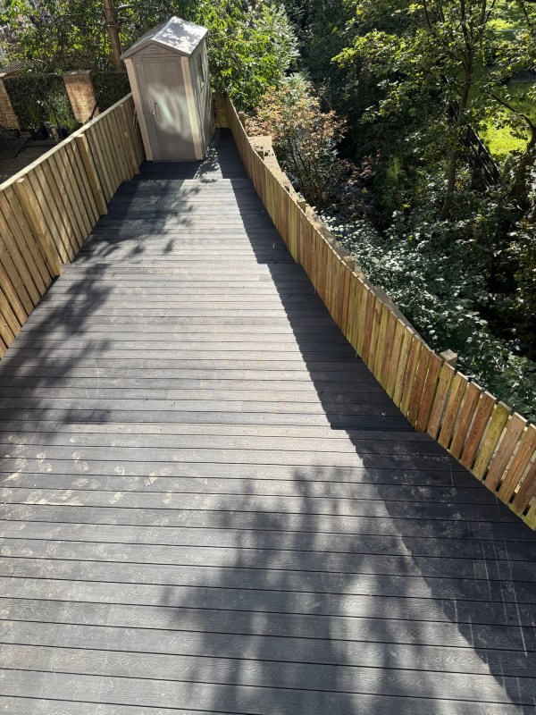 This job includes perimeter fencing and composite decking of a large, sloped back garden – small steps in the decking make this one multi-tiered, and makes us of even the small space space at the back where the garden comes to a head.
