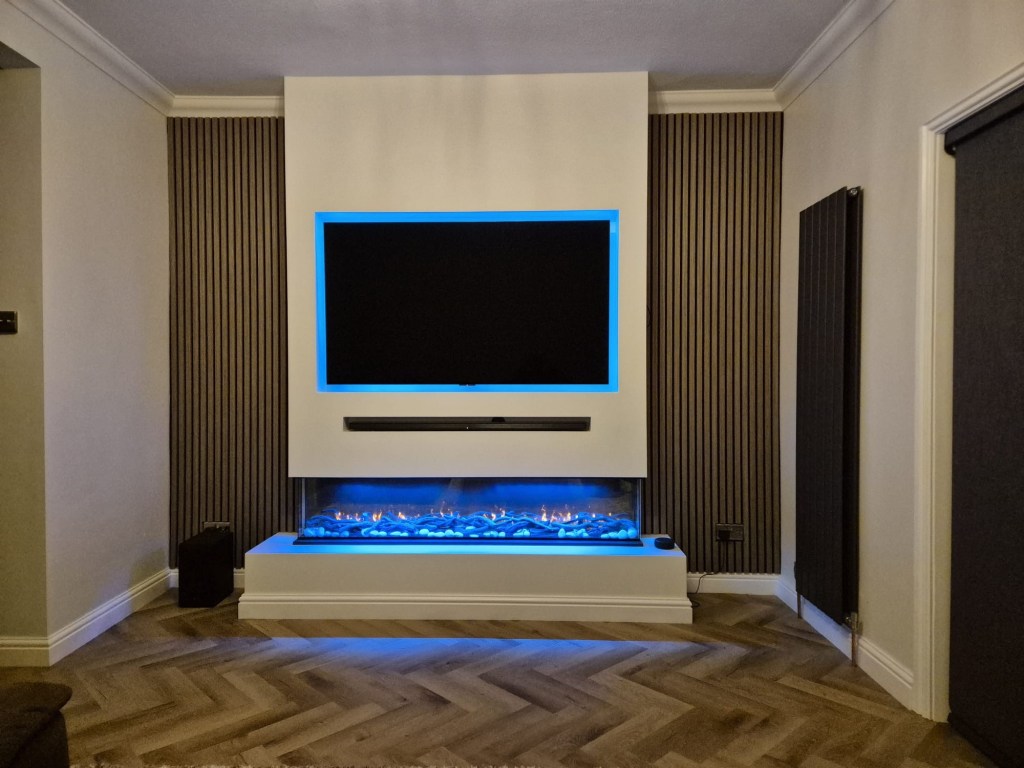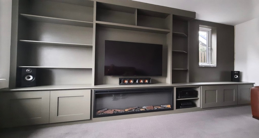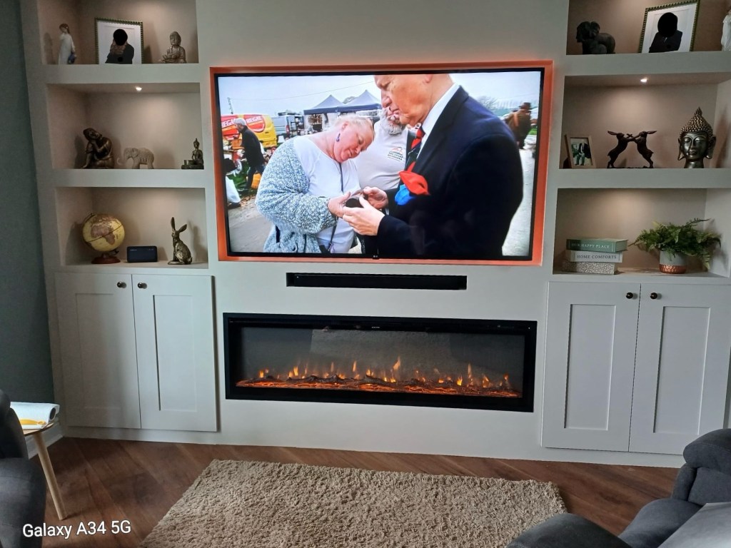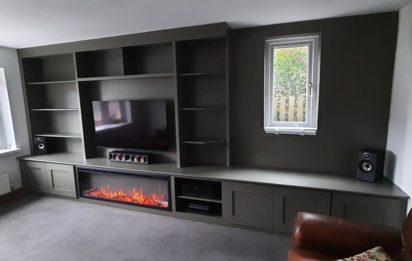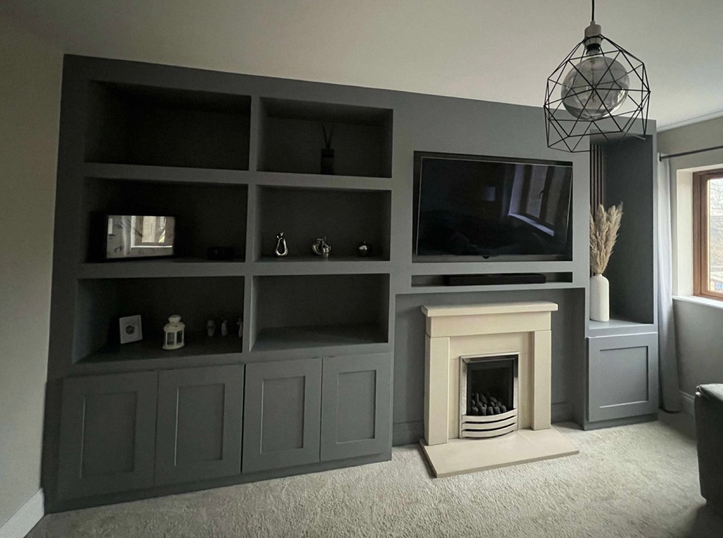 The customer wanted the full wall of their front room working on. This wall has it all – inset TV, large shelving, storage cupboards below, and even a small amount of panelling to finish it off – all surrounding the bright white fire place.