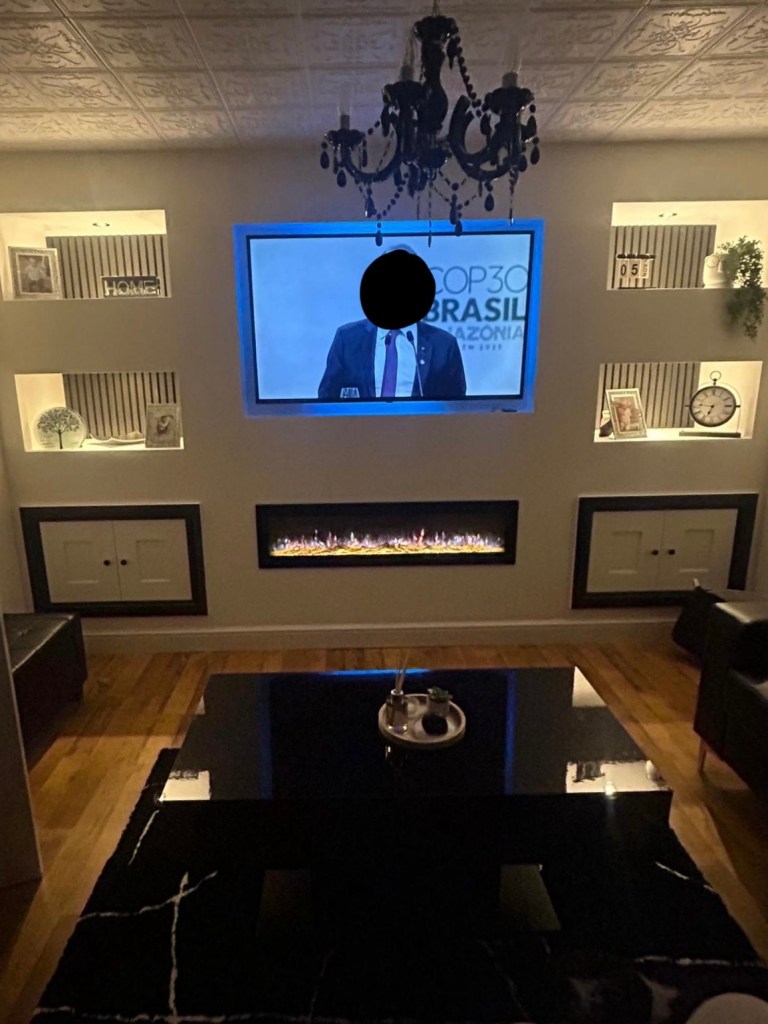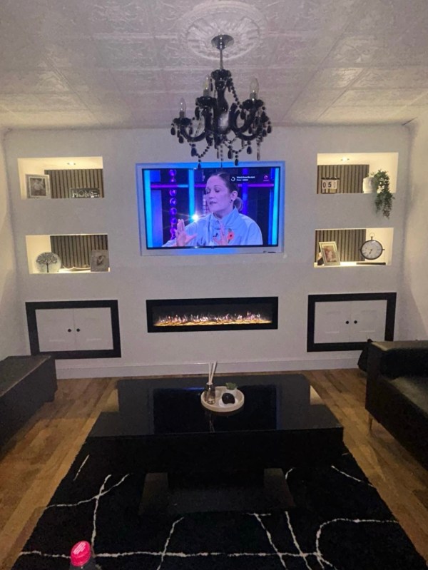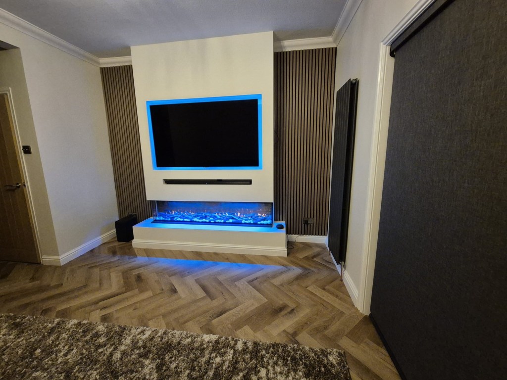 This sleek design incorporates the old, disused chimney breast, making the backlit TV and the fireplace below the main feature of the room. The panelling surrounding either side of the media wall really makes the whole thing pop, and compliments the parquet flooring.
