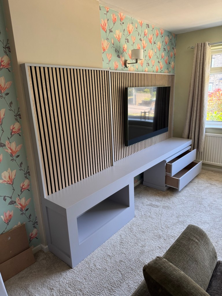 The customer wanted something that would fill the wall without compromising the natural light brought in through the small window. We were able to do this whilst still maximising the shelving space around the TV.