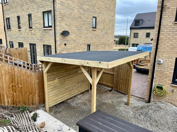 Pergola with a roof and solid back wall.