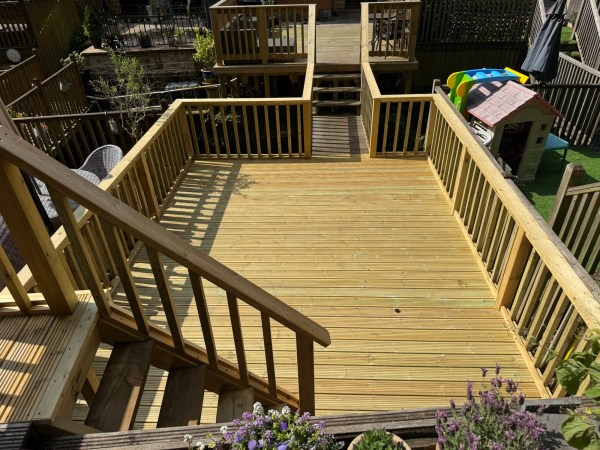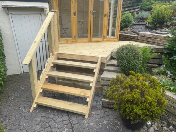 A small decked area leading to a garden room, complete with a small set of matching stairs and safety handrail.